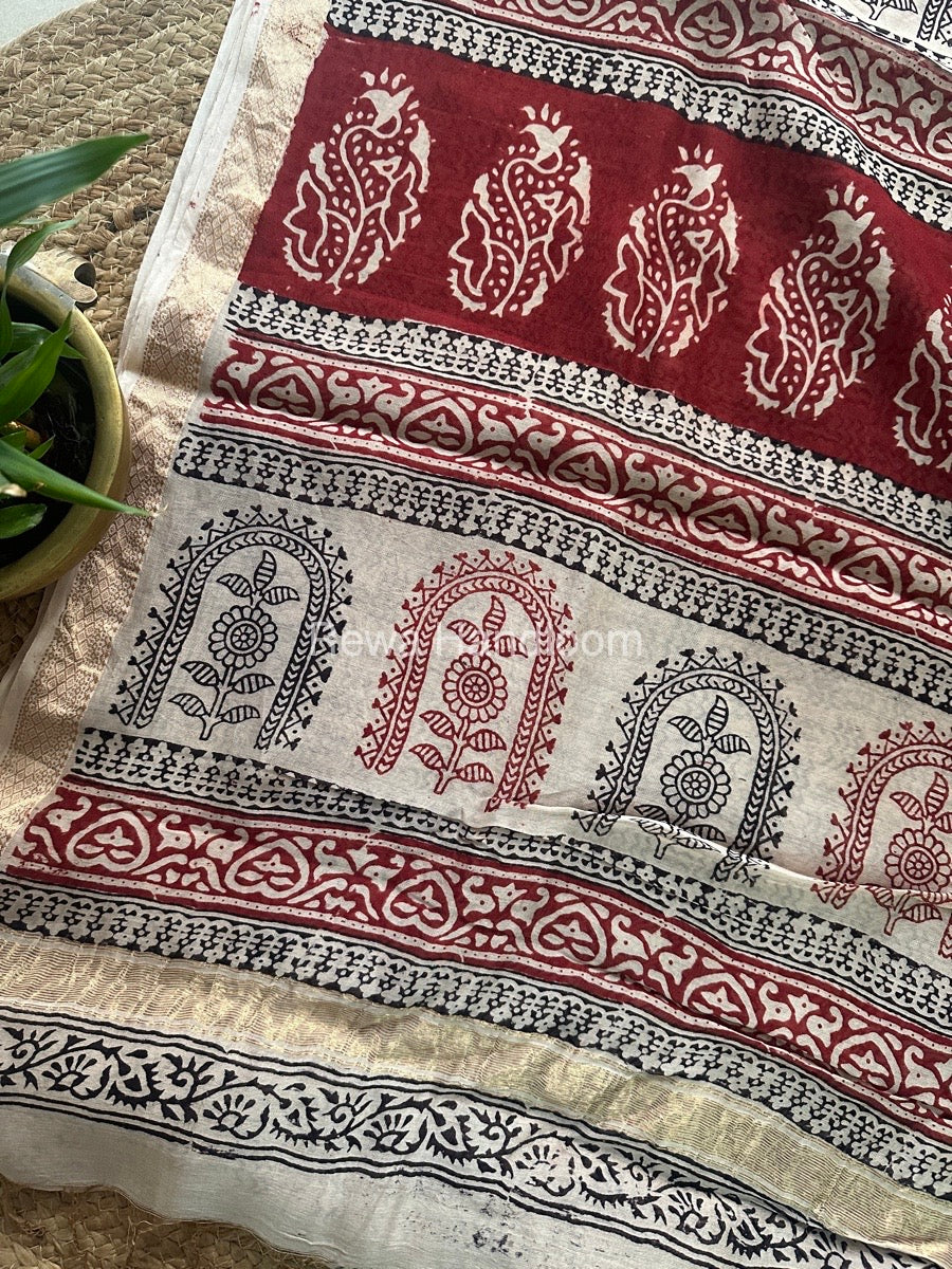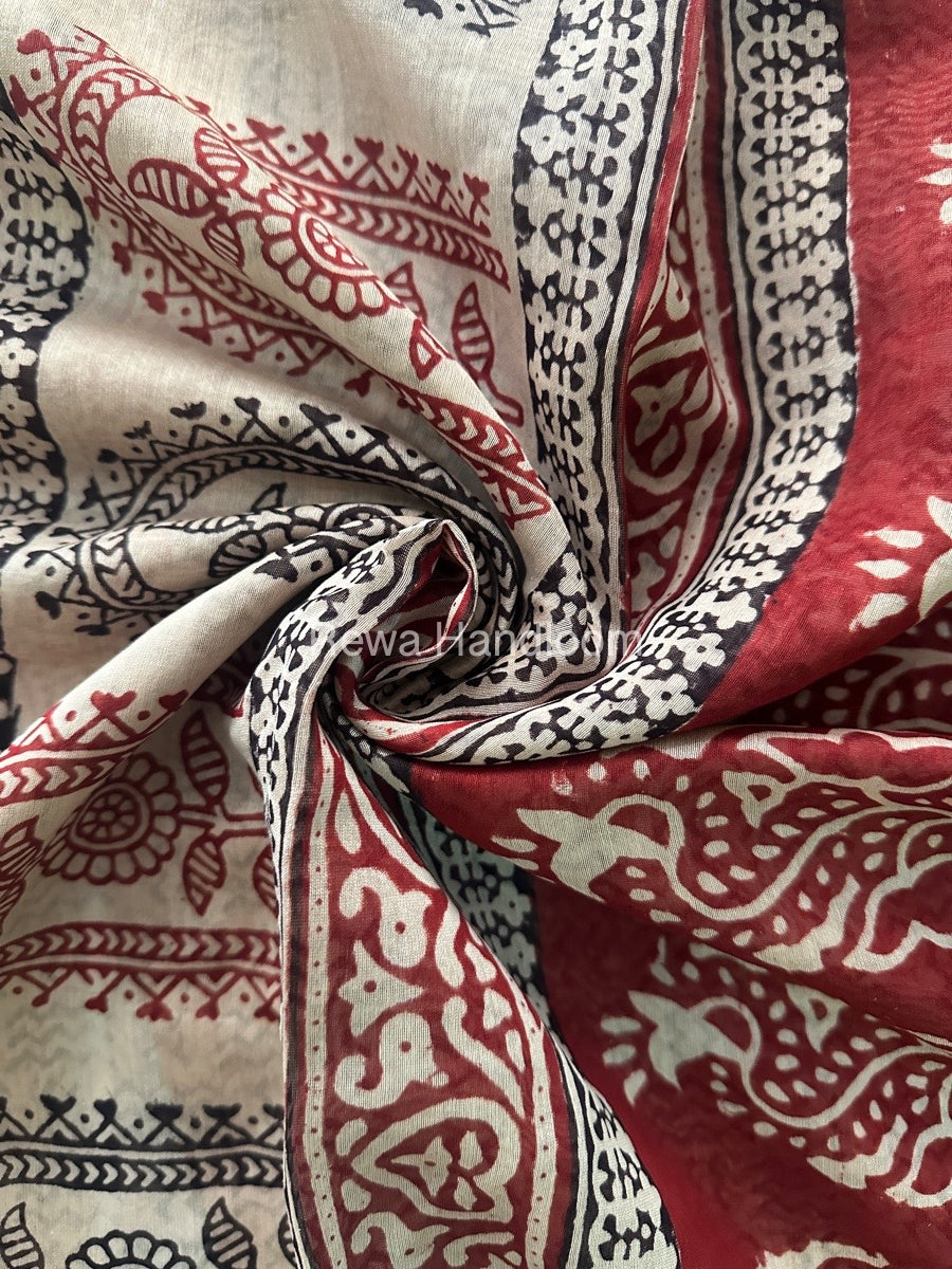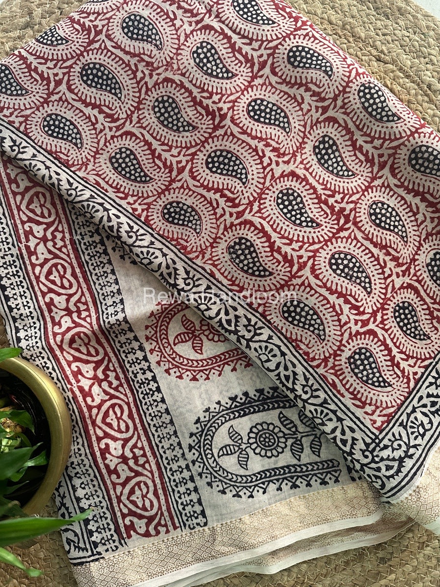 Maheshwari White Red Bagh Print Small Border Saree MTBS031