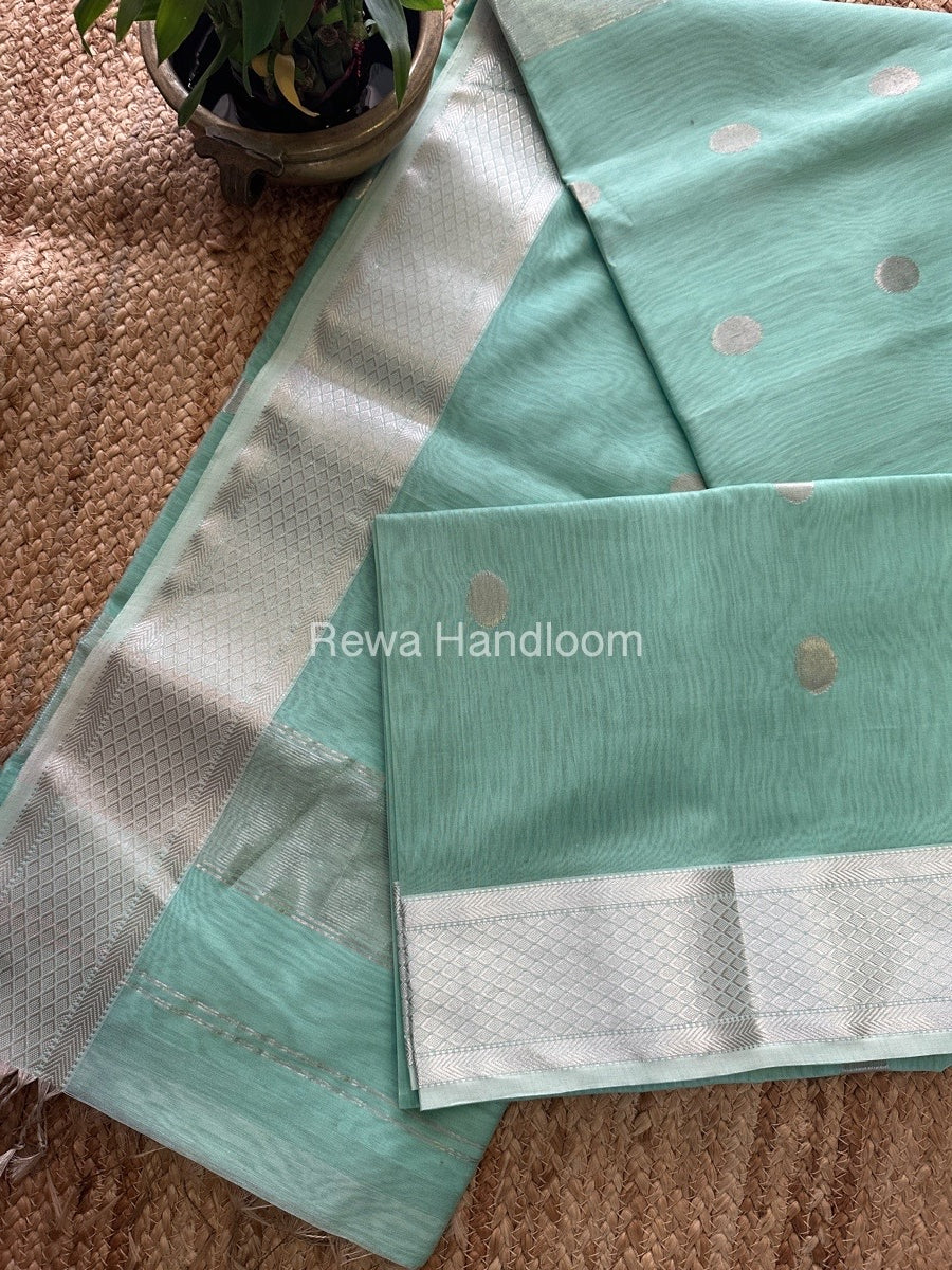 Light Sea Green Silver Coin Butta Pallu Zari Border Saree ~ Maheshwari Saree SCBS03