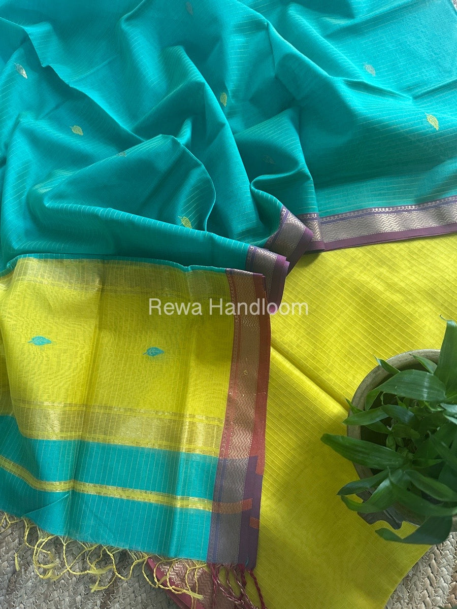 Maheshwari Turmeric Yellow-Sea Green Motifs Top-Dupatta Set PST0114
