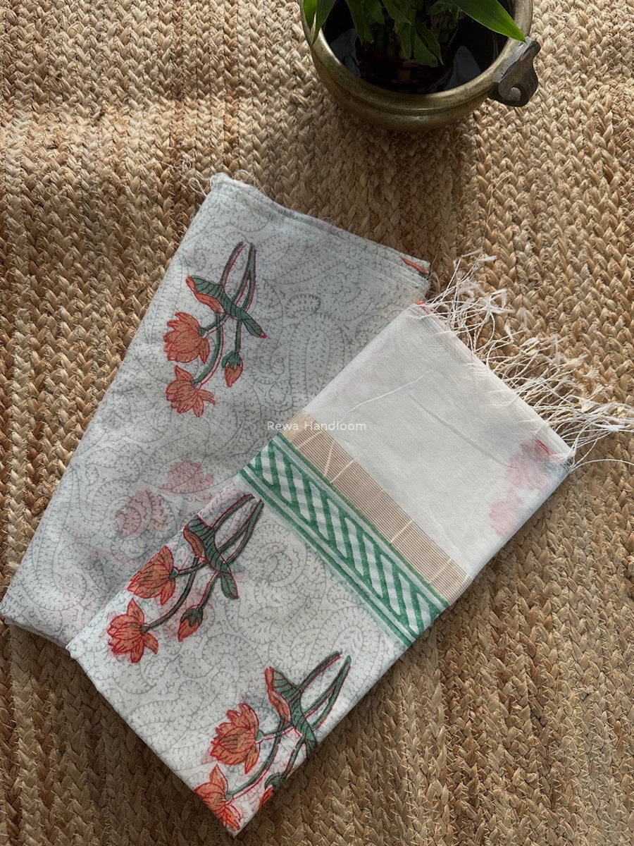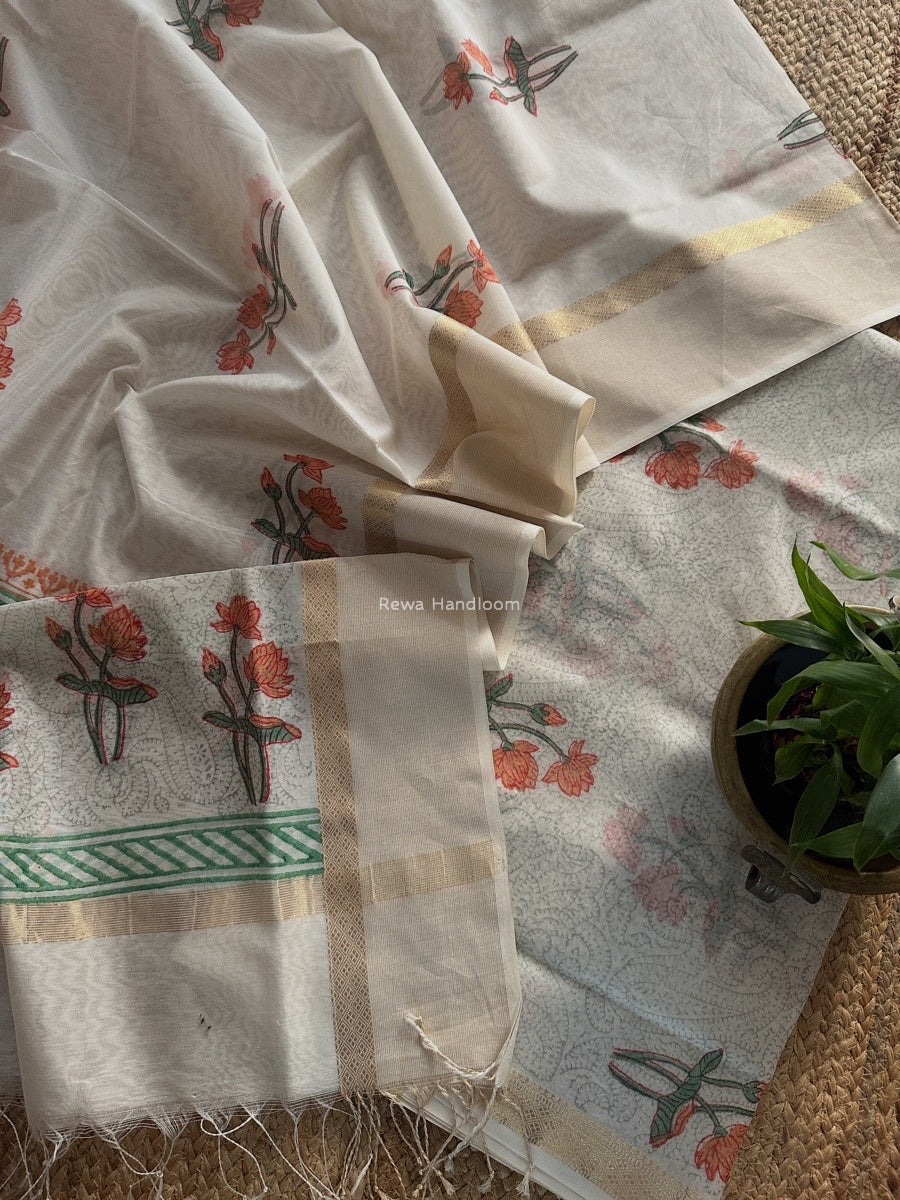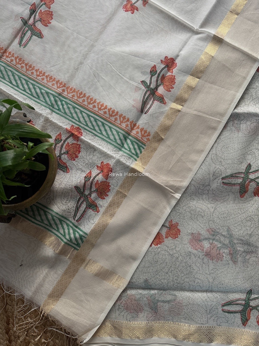 Maheshwari White Handblock Print Top-Dupatta HBS0184