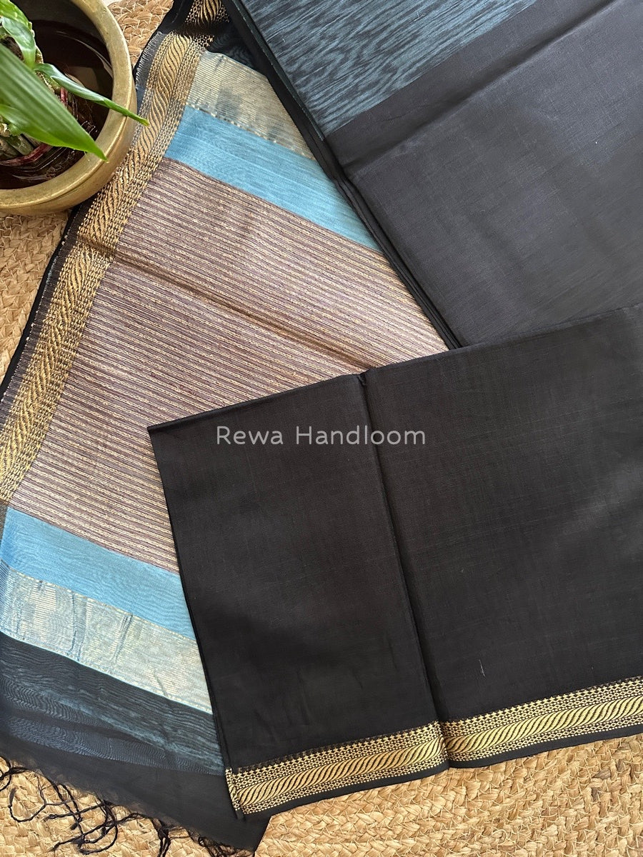 Wrap yourself in the timeless charm of Maheshwari Black Gicha Weaving Saree GPS012 Meticulously woven, this 6.3 meters of sheer elegance comes with an 80cm blouse piece, seamlessly blending tradition with modernity. Crafted by Skilled Weavers of Rewa, the Maheshwari silk cotton blend guarantees a delightful fusion of comfort and style.
