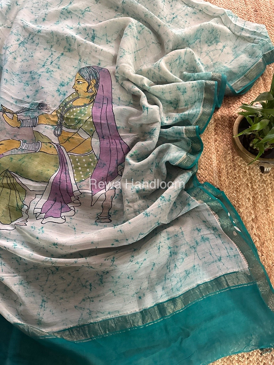 Maheshwari Light Rama Green Batik Figure Handpainted Saree MFPS02