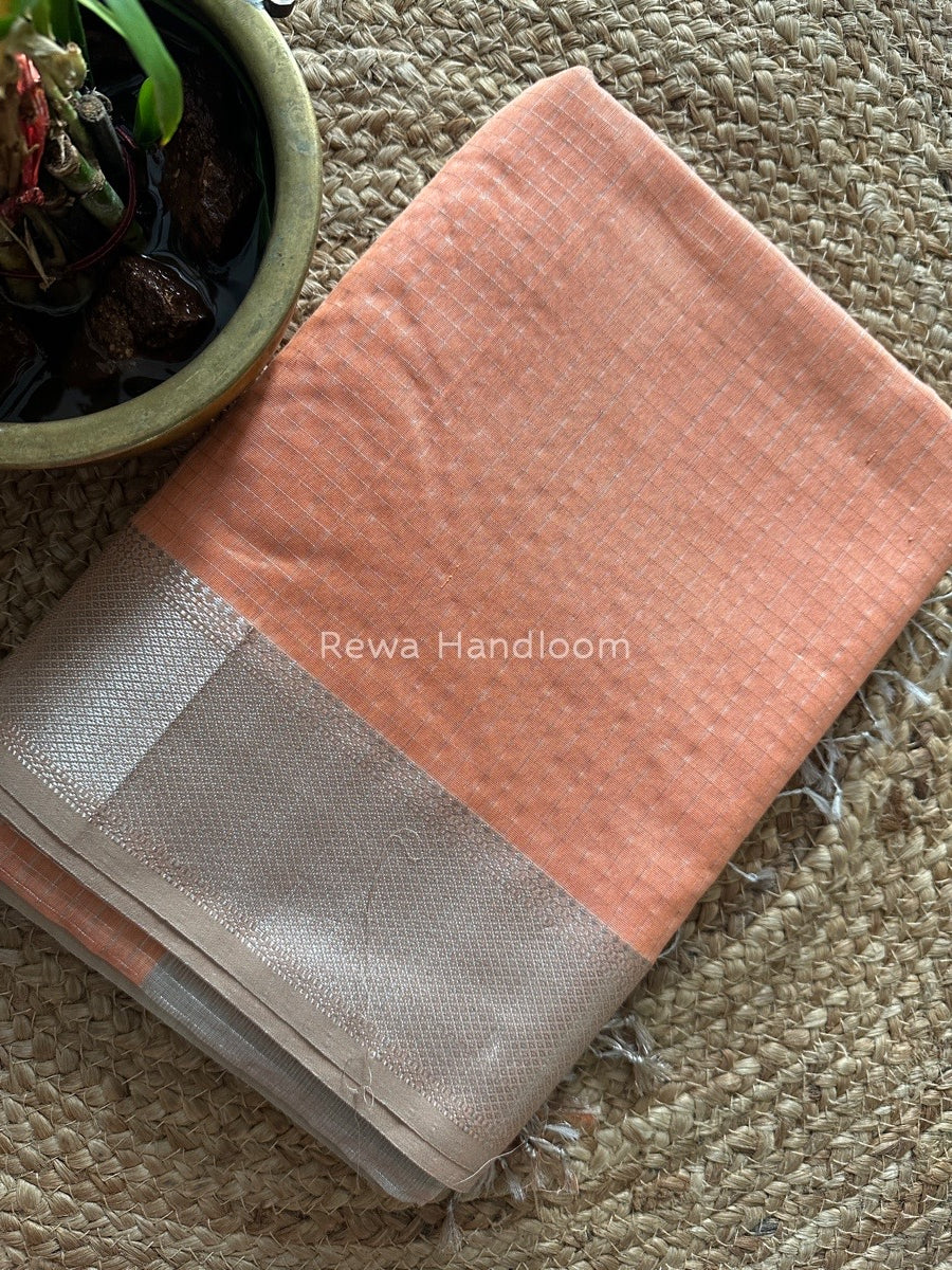 Maheshwari Peach Silver Zari Checks Silk Saree SZ068