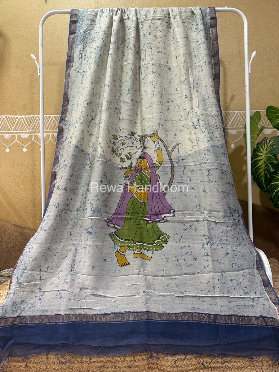 Maheshwari Sky Blue Batik Figure Handpainted Saree MFPS018