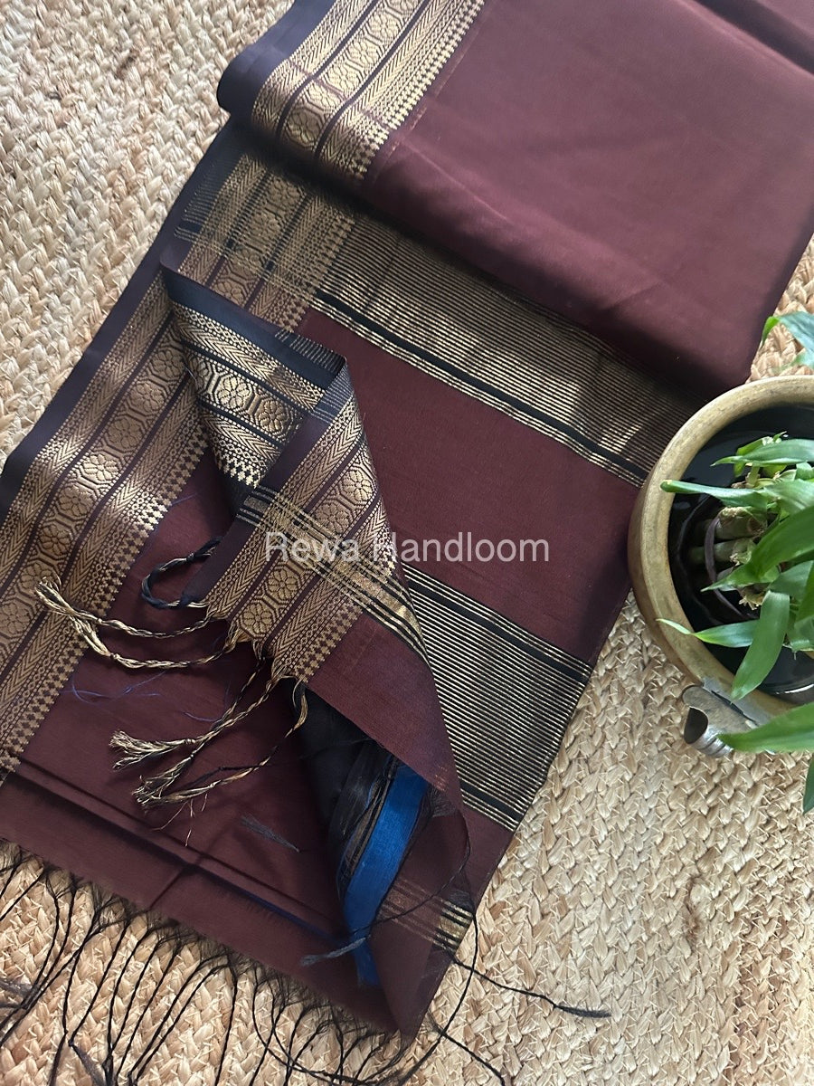 Maheshwari Dark Brown Zari Border Plain Saree ZSBS017