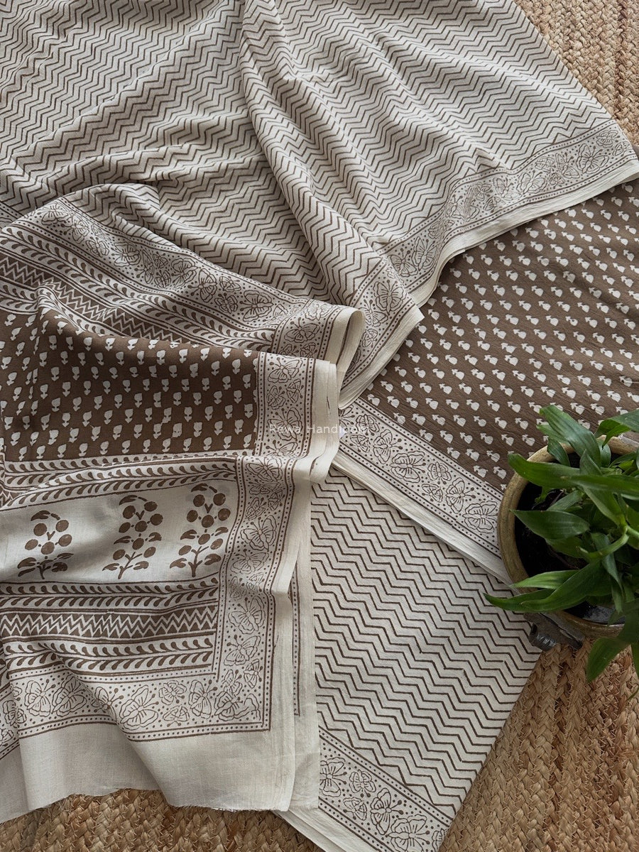 Wrap yourself in the timeless charm of the Beige-white Bagh Print Cotton Suit BCSP0167. Meticulously woven, this 7.5-meter material of sheer elegance comes with a seamless blend of tradition with modernity. Crafted by Skilled Weavers of Rewa, the Bagh cotton Suit blend guarantees a delightful fusion of comfort and style.