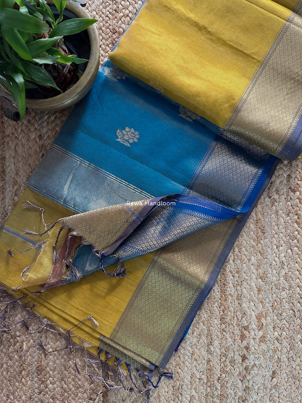 Maheshwari Golden Yellow Tissue Silk Saree TFB022