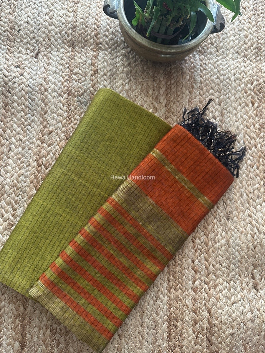 Maheshwari Mehendi Green-Orange Zari Border Dress Material MSBS013
