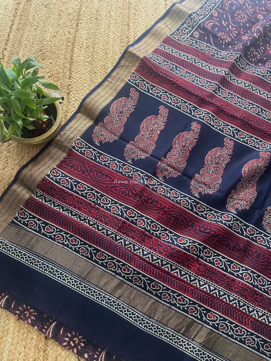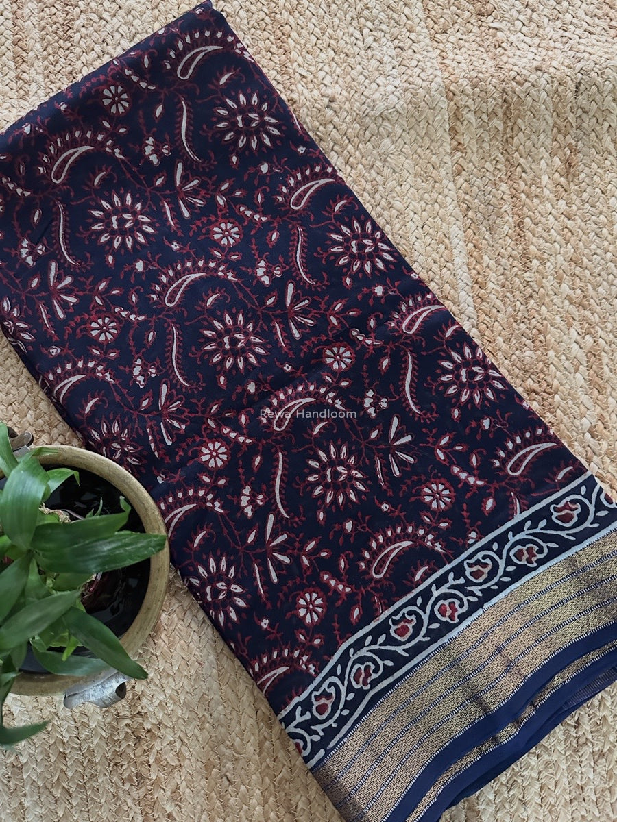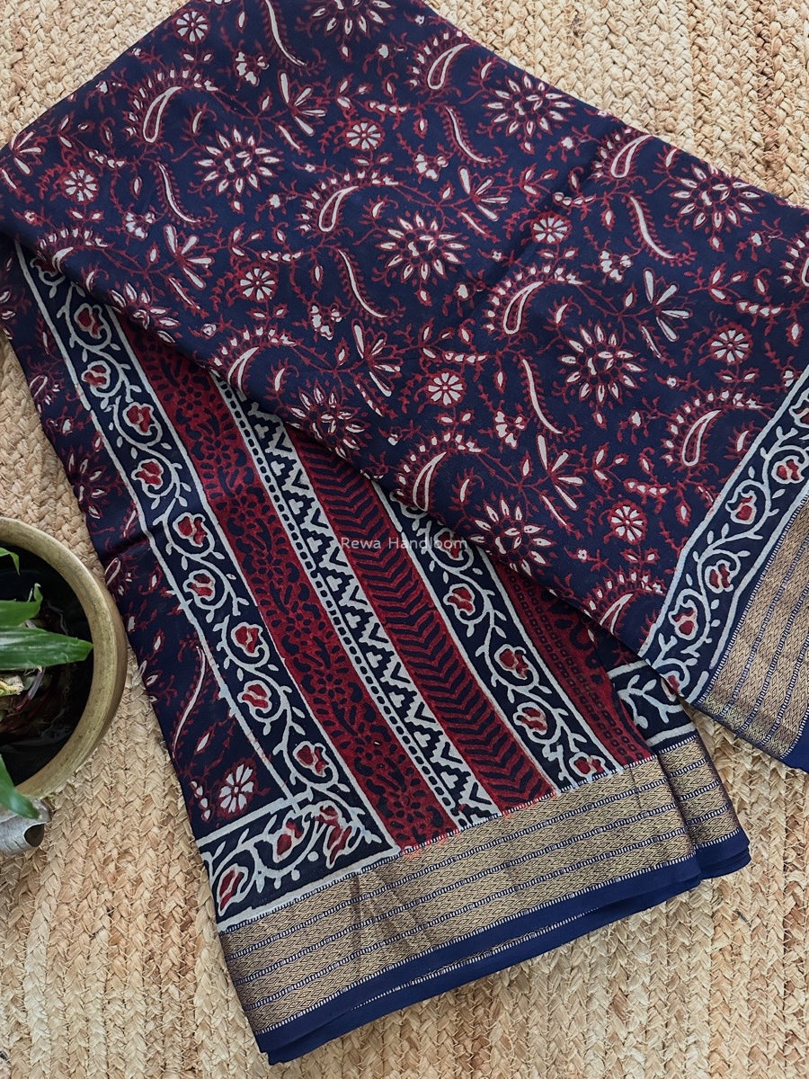 Maheshwari Navy Blue Bagh Print Small Border Saree MTBS123