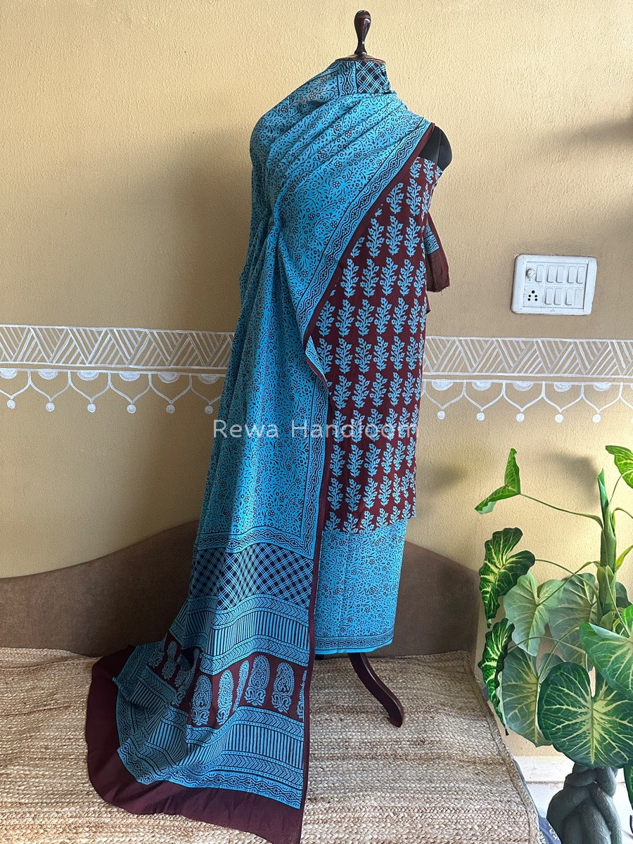 Wrap yourself in the timeless charm of the Maroon-Firozi Bagh Print Cotton Suit BCSP097 Meticulously woven, this 7.5-meter material of sheer elegance comes with a seamlessly blending tradition with modernity. Crafted by Skilled Weavers of Rewa, the Bagh cotton Suit blend guarantees a delightful fusion of comfort and style.